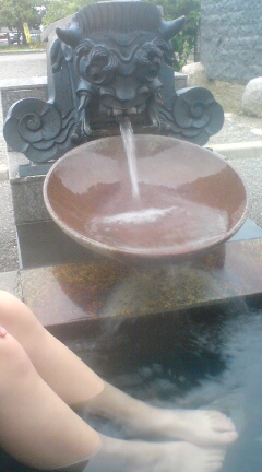 近くの足湯(無料)に入ってコシヒカリソフト(250円)